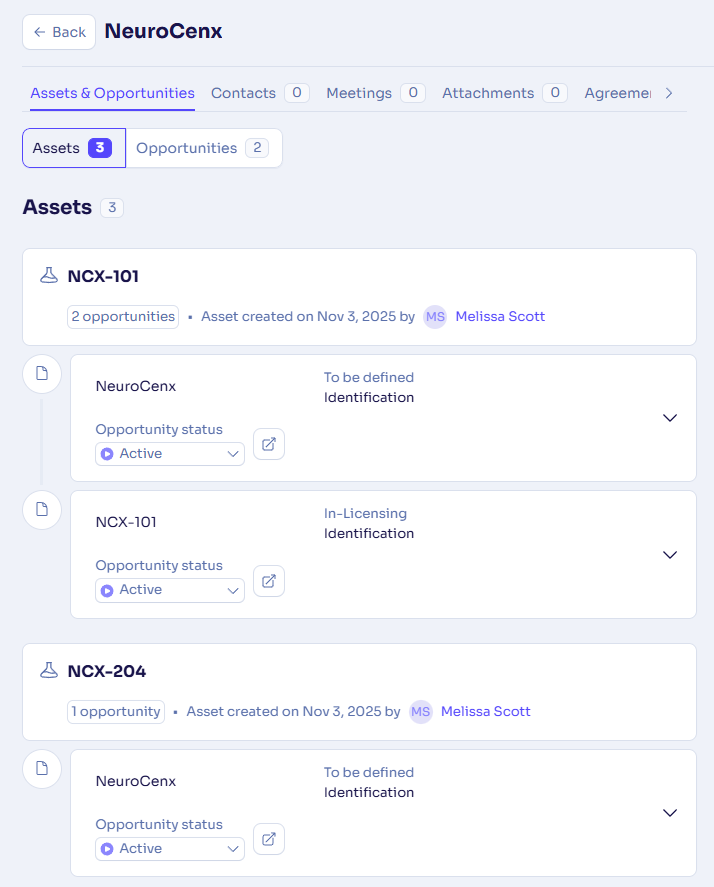 Associated opportunities (based on your access permissions), with their name, status, deal type (e.g. in-licensing, out-licensing...), and workflow stage.