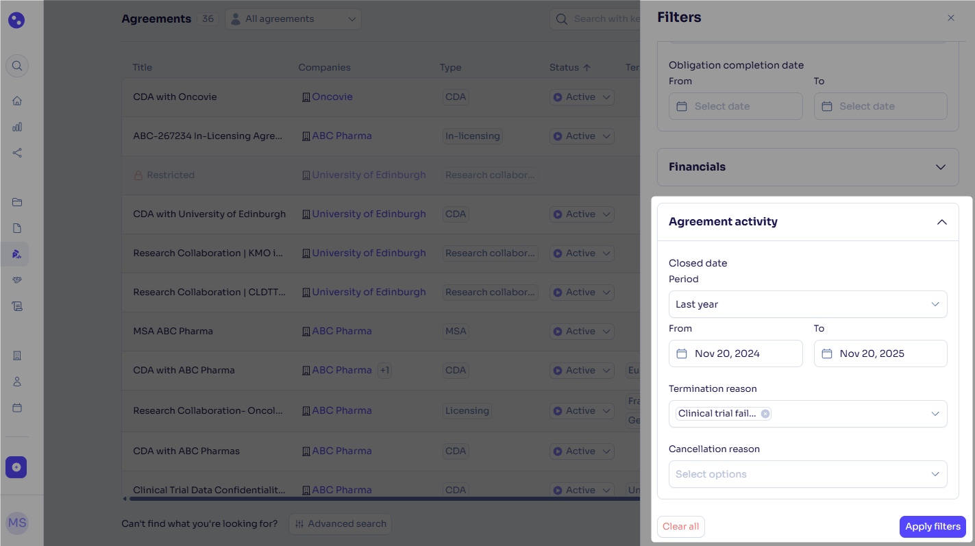 In Deal, on the agreement lists, you can now find an Agreement activity section in the filter to sort agreements based on the Termination reason, Cancellation reason and Closed date.